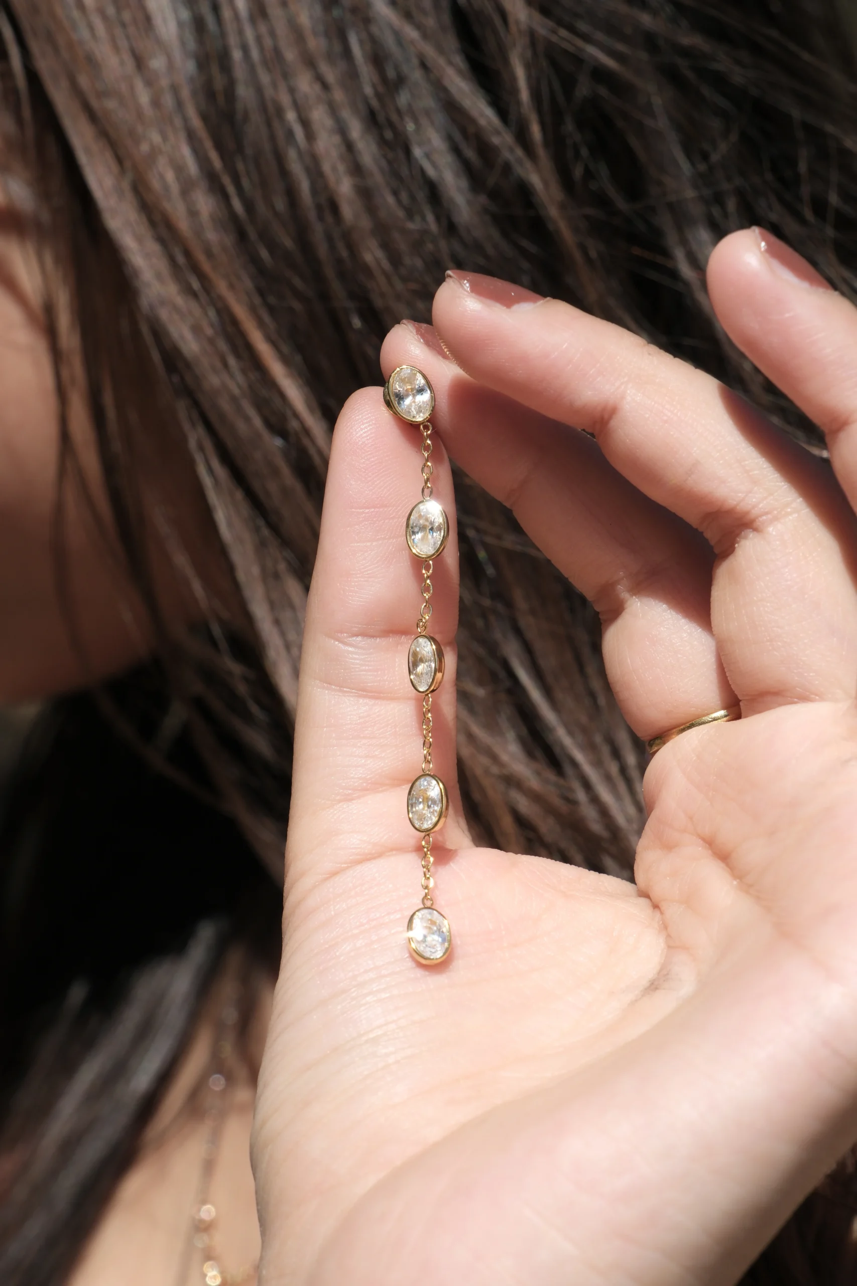 The Crystal Drop Chain Earrings are an exercise in restrained glamour — five bezel-set oval crystals suspended one beneath the other along a threadlike gold chain, each stone catching and releasing light as the wearer moves. The bezel settings in warm gold stainless steel frame each crystal with clean, architectural precision, lending the piece a modern edge that keeps it from ever feeling fussy. They fall with a graceful weight that brushes the shoulder, making their presence known through movement rather than volume. These are earrings for the moments that deserve to be remembered — a dinner, an opening, an evening where you want to feel completely, unhurriedly yourself.